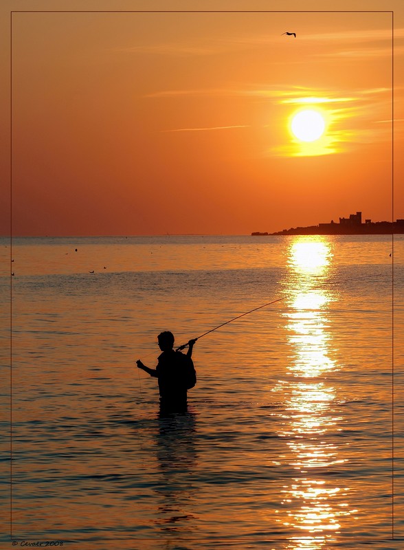 Puis, je fais un bon jusqu'à la fin de saison. Nous somme ici en septembre, le soleil ce couche, il fais encore chaud, les mouettes mangent quelques fourmies qui retombent sur l'eau. je prospecte une plage, mais pas une tape… Sauf que, il reste encore quelque lancers, j'arrive sur une tête de roche. je lance, je strip, vite, doucement, amplement, vite, pose, vite, et là à 3 metres de moi, un éclaire blanc. j'étais à ce moment là entre deux strips, la soie m'échappe donc des mains, le poisson n'est plus là quand je la reprend. On dirais qu'il à fais ça, exprès pour me dire, qu'il reste encore quelques poissons dans ce coins sublime de bretagne…