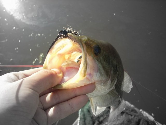 L'objectif est pris, "je ne serais pas un moucheur sportif si je ne prend pas de vrai bass", cette fausse idée me pousse à y aller… au bord de l'eau sale, je repère un poisson, je noue au BDL une mouche que j'ai concocté pour le réservoir. La mouche se pose à 50cm du poisson, un petit strip et boom… c'est parti!! chandelles et etc… tel est la devise du black bass 😉 sensations garanties!